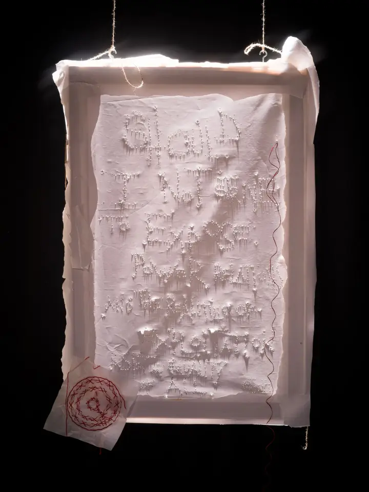Installationens omdrejningspunkt er broderi som interaktivt medie – med lyd, LED-lys og arbejdsstationer, der inviterer publikum ind i værket (i stilhed).